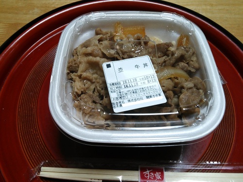 今朝、チョット遅めにゴミ出しに玄関のドアを開けたら、何処かのご家庭で昨日の夕食に出した肉じゃがを温めるような匂いがして、無性に肉が食べたくなったんスよぉ。折しも炊飯器のセットをしてないので朝食のご飯もないし、嫁は朝はご飯食べないし、ココは一つ牛丼でも食べようかと。 で、近所の「すき家」のお店に行ったんだが、久々に入ったせいか怖気づいてというか、落ち着かなくてお持ち帰りで「牛丼並盛り」350円(税込)を注文してしまったんスよ。 家に持ち帰って早速頂いたんスけど、さすがに350円としてはコスパは高いっすよねぇ。あえて苦言を申せばお持ち帰りで汁ダクに出来ないせいか、肉のパサパサ感は気になりましたが、まあこんなもんでしょう。そう言えばお店でこういうのは販売してなかったか確認するの忘れた。【すき家の牛丼】 すき家 牛丼の具 並盛135g×5パックセット 【トロナ】 冷凍食品【湯煎・電子レンジ調理可】【re_26】 【ポイント10倍】【p10_seiポイント10倍】【sa_sei】価格:1636円(税込、送料別) (2016/11/19時点)