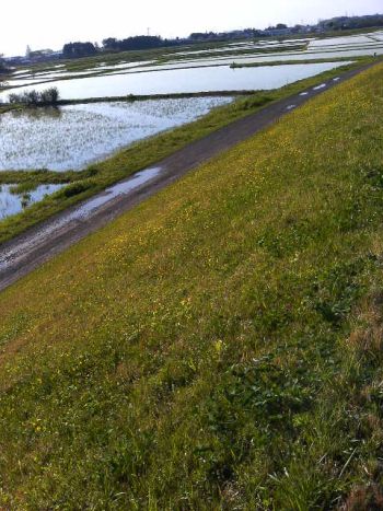 鬼怒川の河川敷を歩いていると、もう田植えが始まっている。水を張った田んぼが一面に広がっている。もう田植えが済んでいる所もある。忙しさに感けて散歩をサボっているうちに、何時の間にか季節は少しずつ動いている。堤には キンポウゲ科 ウマノアシガタ(馬の脚形) が咲き揃っているのだ。真っ青な青空の下で、少しずつ緑色が濃くなっていく堤に転々と黄色の花が咲いている光景に暫し目を奪われてしまった。