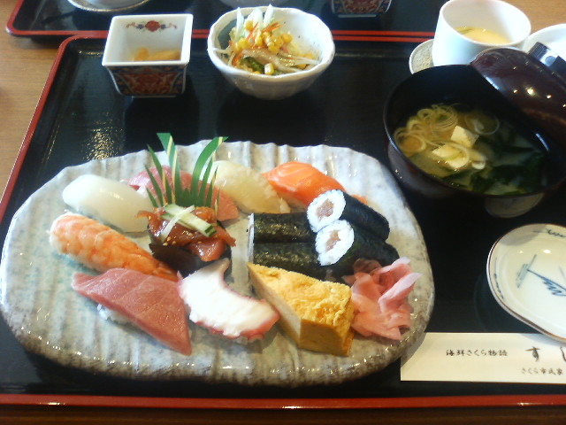さくらにぎりのネタは、玉子、蛸、中トロ(2貫)、海老、烏賊、鮭、漬けマグロの軍艦巻、ヒラメ?、干瓢巻である。お店の方の好意で9日からの「さくらサクサククーポン券」とやらの特典である食後のコーヒーも、クーポン券無しで出してもらった。にぎりが小さめで、大食漢には物足りないかも知れないが、小食の自分には十分である。久し振りに頂いた 中トロはなかなか脂が載っていて美味しかった。この値段で中トロが2貫付くのはお得 だと思う。