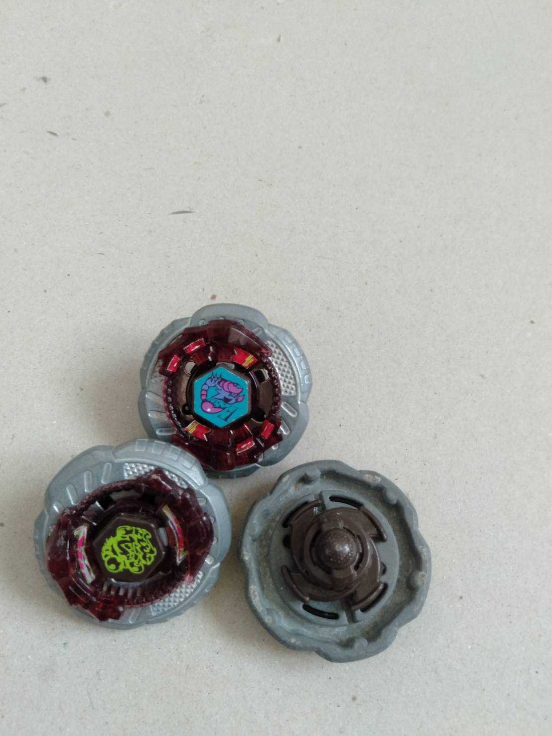 持っているベイの紹介です.ロックエスコルピオです.ジョグボールが特徴です.ボールボトムに,つぶつぶがついています.バトルで使用するごとに,つぶつぶは,少しづつ削れていくでしょうから,だんだんとボールボトムに近づいていきます.