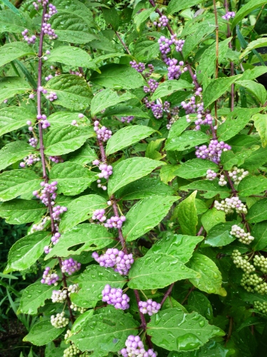 庭の紫式部 まだ白い所が残っていて 紫からのグラデションがおもしろい まだまだ 雨が多く 蒸し蒸しする お彼岸のある月