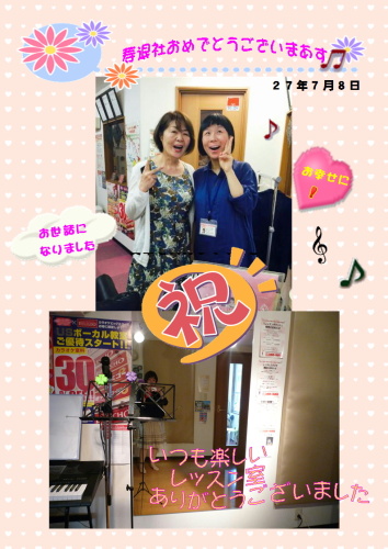 ヴォーカル教室の担当の先生が 10日で寿退社されます 先生との最後のレッスンはぎりぎりの今日8日 おなかにも命が在っておめでた続きの先生です 体験レッスンから今日まで 本当に楽しいレッスンでした 気さくでユーモラスで 年齢差を感じませんでした 教え方は 絶品! 褒めて育てるタイプ(笑) 歌う楽しさを教えて下さった さやか先生ありがとうございました 元気な赤ちゃんを産んで下さいネ おめでとうございます