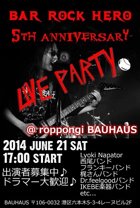 非日常を体験するって色々あると思いますが、土曜日にバリバリのロックのライブへ行って来ました。六本木”バウハウス”を貸し切って開かれたいとこ甥のお店5周年パーティーです。 彼の店は渋谷にある”BAR ROCK HERO”、開店当初に飲みに行ったきりでそれ以来のご無沙汰です。 ガンガンのヘビメタロックなんて親戚でもなければ、たぶん一生縁がなかったと思います。 異空間で過ごす貴重な非日常体験、いつの間にやら騒音が快適な音楽にかわり身体がノリ出したのにはびっくりです。彼らのオリジナルナンバーが中心でしたが唯一、スティービーワンダーの「迷信♪」は懐かしくて最高でした。 ひと時、そのパワフルな演奏が自分の中でエネルギーに変わり元気をもらいました。ヒロくん5周年盛会おめでとう!! バックNo.283:素敵なお付合い仲間(↓スクロールしてネ) ◆金曜日限定で開場コーヒー市場、次回27日(金)13~17時 ◆Twitterはこちら”@sunny_friday_ ”是非フォローして下さい。 ■サニーフーヅオンラインショッピング■ ●コーヒー豆 ●サワー濃縮果汁 ●フルーツ&フレーバーシロップ 人気blogランキングに参加中応援いつも感謝です^^♪