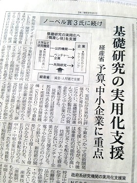 先日日本の3氏がLED照明の研究成果でノーベル物理学賞を受賞した。大変喜ばしいことである。10日付の日経朝刊には、経済産業省がこれからの科学技術開発に予算面で支援するという記事が出ていました。 受賞した中村教授のLED開発の苦労話は有名である。予算がなくて上司とも幾度となくぶつかり、開発に至る原動力は怒りだったと言います。その逆境とくやしさを力に代えて、偉大な賞を受賞したことに敬意を払います。経営者の立場から言えば、生産性のない研究費に予算を取るのは大変難しい。今回特に中小企業へのバックアップを現状の10%弱から30%に拡大するという部分に注目したい。資源のない日本だけに、科学技術の開発はこれからの日本の大変重要な財産になる。 ■サニーフーヅオンラインショッピング■ ●コーヒー豆 ●サワー濃縮果汁 ●フルーツ&フレーバーシロップ 人気blogランキングに参加中応援いつも感謝です^^♪