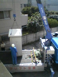 今朝早く、当サニービルに設置する電機のキューピクルが4トンのクレーン車で搬入された。決まった定位置に降ろすだけの作業なのだが駐車場のクルマを5台移動させて周りもしばらく規制させて結構手間がかかった設置作業になった。