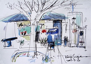 ブルーの配色がとても素敵な横浜のカフェです。写真から描いているのですが、木立と共に明るくイメージアップされた大変好きな絵です。