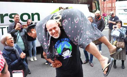 力士たちもそれぞれオフタイムを楽しんでいる。現地の相撲チャンピョンに担がれた翔猿関。 -