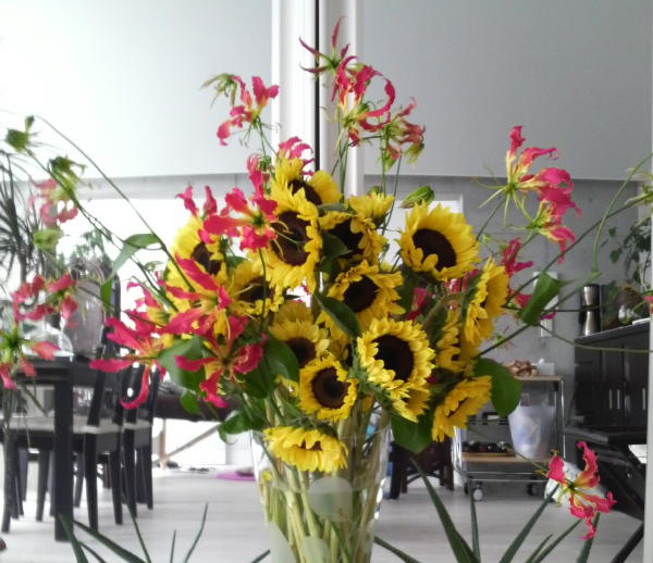 ひまわり夏と言ったら・・ひまわり~~でも 戻り梅雨っぽくって・・・・一向に暑くない梅雨明け宣言したのにね・・・・まっ、過ごしやすいからいいんだけどね スッチーを花にたとえたらな~~にかな?って質問で「ひまわりかな!」って言われたのは・・・実の兄からそれからは薔薇も好きなんだけど ひまわり だーーーーーい好き 昨日はズンバから始まって 3本メユーこなしたよ慣れたのか・・・身体に鞭打ってるのか・・分かんないけど・・楽しかったら それでいい~~帰りに寄ってるキリンシティでのブラウマイスターがアサヒが出してる 「アサヒザ・マスター」にそっくり~~~アサヒが真似たんでしょうけどね(違うか^^)ドイツ伝統ピルスタイプだから 似てて当然かなこれじゃあ~~~ジムの帰りにコンビニで缶買って欲求を満たすかもね・・・間違っても路上では呑まないように 久しぶりにリース作り(生花で) クルクマとアガパンサス