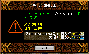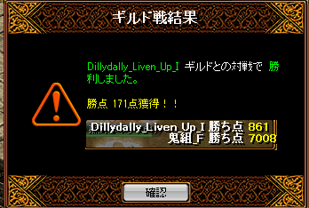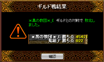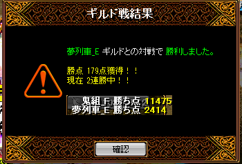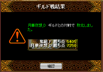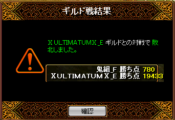 こんばんはーヽ(*⌒,_ゝ⌒*)ノ鬼組がGVを再開して1ヶ月ちょっと経ちました!アリーナにおける鬼組の位置も大体定まってきたと思うので、今までは後入れのみでやっておりましたが先入れもすることに!そして本日のお相手はULTIMATUM様でした。(記号が表示できないようなので略させていただきました。)結果前回私がpc止まってしまい中盤~後半逃げになってしまって申し訳なかったGVでしたが・・・。今回は参加が16→8に(´;ω;`)前回勝利したので、後入れしていただいたのではないかなと思いますが期待に応えれなかった感じですね(´-ω-`)対戦ありがとうございました!そしてついに鬼組に・・・佳子様キタ━(゚∀゚)━!ギルドの輝かしき未来が見えたような気がしました。
