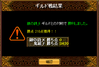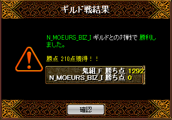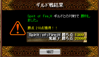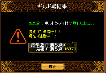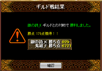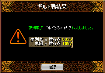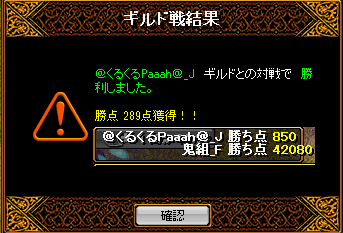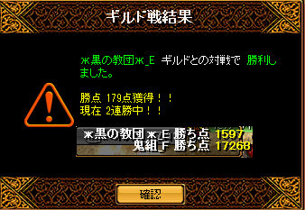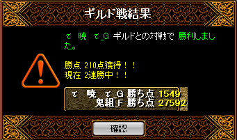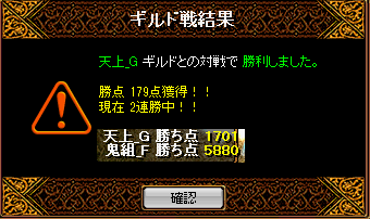 天上様とGVがありました。月曜日一部に入れるね~って言ってたんですけど、ランク近めのギルド様が見当たらず天上様に入れさせていただきました(*`・ω・)ゞ結果しょ、勝利・・・(ゝω・)v内容としてはこちら2ptでお相手が1pt+ソロでした。(たぶん)ソロしてる人を倒せたので少し点差が広がりましたが、1pt丁度だった場合すごく僅差になっていた気がします。久しぶりの1部相手のGVでみんな必死でしたね(`・ω・´)対戦ありがとうございました!今日は佳子様の足止めが光ってたかなー。勝因は奈南川氏(バイト中)の指示通り動けた事も大きかったでしょうね(大嘘)