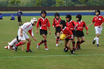更新が遅くなり、すいません。6/6(日)鈴鹿スポーツガーデンにて、2009年三重県ラグビー祭が開催されました。午前中は、ラグビーキッズパークの中で、1~2年生はホンダヒートの選手との交流、3~6年生は四日市Jr.さんとの交流試合を行いました。その後に、三重県のU17セレクションマッチが行われました。 (3~4年生の試合風景1)(3~4年生の試合風景2)試合結果は残念でしたが、みんな始めたばかりなのですから、まだまだこれから上手く強くなっていきます。継続して練習頑張りましょう! (5~6年生の試合風景1) (5~6年生の試合風景2)午後は、ラグビー祭のメインイベント、ホンダヒートvsコカコーラウエストレッドスパークスでした。試合前のセレモニーでは、鈴鹿RSと四日市Jr.の生徒による選手のエスコートを行いました。試合中は、みんなで地元ホンダヒートの応援をしました。 (エスコートキッズ風景)