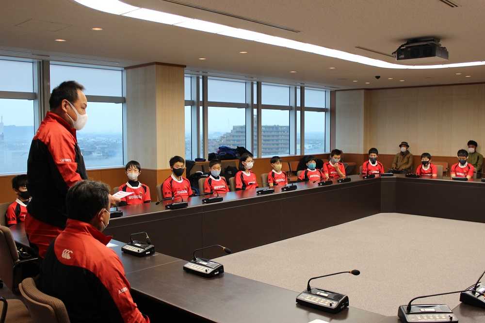 1月22日ヒーローズカップ東海北陸大会優勝(Aブロック)と決勝大会出場の報告に鈴鹿市長を表敬訪問させて頂きました。MiTコーチからの結果報告と、6年生13名からの決勝大会に向けた決意表明!マスク越しでしたが一言一言力強い決意表明でした(^^)最後は市長から激励のお言葉。ありがとうございました<(_ _)>1月30日31日(@日産スタジアム)に予定されていた決勝大会はコロナの影響で延期となり、先行きが不透明な中ではありますが、実施される事、そして行ける事を信じて、東海北陸の代表として、胸に刻まれる「SUZUKA」の名と共に全力で戦ってきます!表敬訪問に際して、段取りや調整などなどご尽力頂きました皆様ありがとうございました!