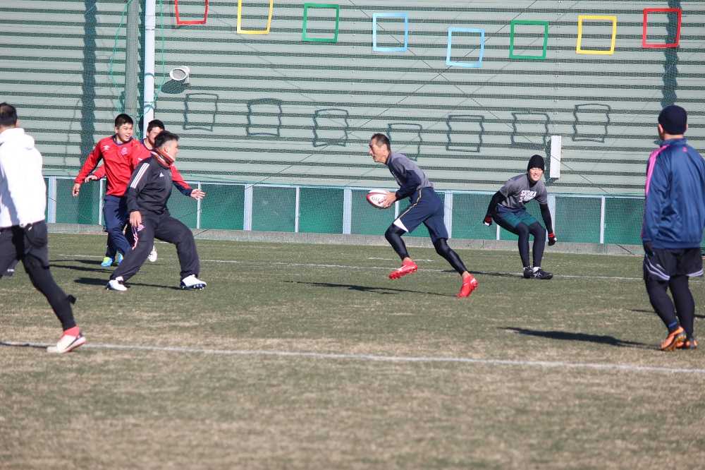 1月10日練習初めチャレンジマッチのパートⅡはOBとコーチのチャレンジタッチフット(^^)vOBたちコーチたちの笑顔がなんとも言えませんね。ラグビーの名言として有名な「ラグビーは子どもをいち早く大人にし、大人にいつまでも少年の心を抱かせる」そんな名言が頷ける少年のような笑顔です(^-^;