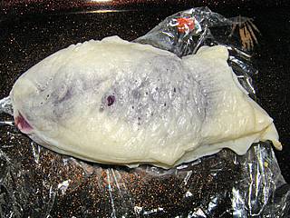 先日イトーヨーカドーで見かけて、うちへのお土産に。まず皮が白い。そして何故かラップに包まれていました。食べてみると、どうも上新粉の様です。ラップに包んでおかないと、冷めて水分が抜けるとお米みたいに固くなるのかな(笑)。皮が柔らかくて少し食べにくいのですが、お餅みたいにやや粘りがあって美味しかったです。中身は紫芋餡。紫芋をすり潰しただけでなく、小さな塊も入っていました。間違って入ってしまったのかもしれないけど(笑)。私が知らないだけかもしれないけど、目新しい鯛焼きに満足。1個140円也。