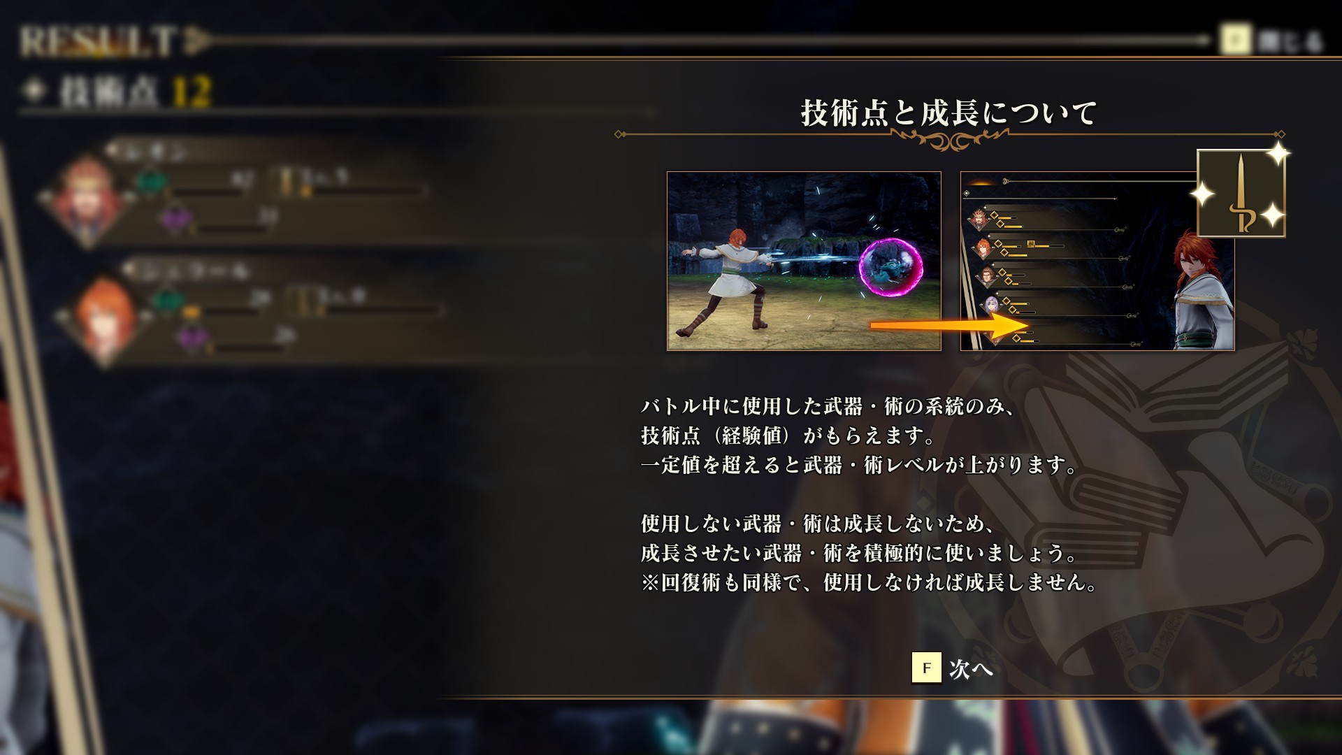 戦闘中に取った行動に応じて、武器や術の熟練度が上がっていくので色々な行動を取りたくなります。