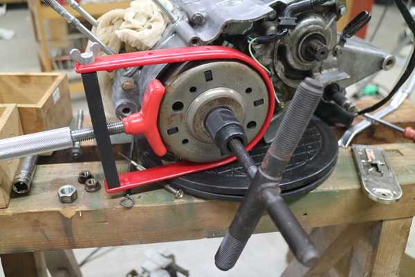 次は左側のフライホイールだ。これは以前水没したような形跡があり、底部に酷い赤サビが出ていたので、3号機の物に取り替えてあるのだが、側面全体に錆が発生しているのでフライホイールプーラーで外して、ナイロンディスクで磨いた。外したついでにクランクケースの奥を確認してみると、一番下のボルトが真っ赤に錆びていたので、3号機のボルトと交換しておいた。フライホイールに線が引かれたような錆と、クランクケースの錆びたボルトは明らかに浸水によるものと思われるが、長い間エンジン下部が水に浸かっていたのであれば、他にもその痕跡が残る筈であるが他の箇所は水没したような形跡は無い。通常バイクはスタンドを掛けて車体を立たせているが、このバイクはサイドスタンドしかないので車体は左に傾いた状態で保持されるので、エンジンカバーの隙間から雨水が浸入したとしても、フライホイールが水に浸かる事は無い。1つ考えられる事は、ピックアップ時の事はよく覚えていないが、解体屋なのでバイクを斜めに倒したままで放置していて雨水が溜まって錆びたのでは無いかと思われる。1号機でクランクシールが抜けてエンジンが掛からなくなり、原因究明に手こずった経験から、クランクシールもトラブル予防のために購入しておいたので、ジェネレーターを外して確認してみると、こちらは大丈夫だったが少しオイリーなので精密ドライバーで抉って抜こうとしたが難しい。クランクを割って抜くしか方法が無さそうなので、諦めた。1号機のように劣化して抜けたら、交換する事にする。外したジェネレーターを取り付けるにはステータのケガキ線とクランクケースの合わせマークを合わせる必要があるので、ジェネレーター取り付けステーの穴は楕円になっている。フライホイールの溝をウッドラフキーに合わせて嵌め込む。センターナットの締め付けトルクは5.0~6.0kg-mだ。これでやっとエンジンの整備を終える事が出来た。ビストンとシリンダーも程度の良いものと交換したので、安心ではあるが無事始動できるか一抹の不安もある。それにしても3号機のエンジンを保管しておいて助かった。物は沢山持っている者が勝利するのが世の常である。今日はきっとビールが美味いだろう。フライホイールプーラーを掛けてフライホイールを外すクランクシャフトから外したフライホイール外周は結構錆びていた真っ赤に錆びていたクランクケース接合ボルトクランクシャフトに正常に嵌め込まれているオイルシールステータのケガキ線(青丸)とクランクケースの合わせマーク(赤丸)を合わせる組み立てが終わったエンジン上部塗装したシリンダーと錆取りを終えたフライホイール