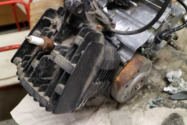 クラッチカバーが終わったので、ピストンの状態を見てみるべく取り外しに掛かる。リードバルブが付いたままでも取り外しは出来るが、酷く汚れていたので外す事にした。因みにリードバルブにはガスケットが2枚付いているが、外側のガスケットは廃番になっていたので、内側(エンジン側)のみ購入しておいた。(リードバルブガスケットA・14132-GE2-000)リードバルブも頑強に張り付いているので、スクレーパーを当てて、プラハンで加減しながら叩いて外した。これも複雑な形状をしているので、マスキングをして、簡易ブラストで汚れとアルミ錆を落として、塗装、クリヤーを吹いて乾燥させる。次はいよいよヘッドナットの取り外しに掛かる。プラグを外し、12ミリのナットを4本外すだけなので簡単な作業であるが、どのナットも酷く錆びているので嫌な予感がしたが、ここは大トルクで締め付けている箇所ではないので、ラチェットレンチで緩めるもビクともしない。左手でエンジンを押さえつけ、渾身の力を掛けるが緩まない。どのナットも固まってしまっている。スタッドボルトのネジ山が真っ赤に錆びているので、抵抗になっていると思われるが、それにしても酷い固着だ。仕方が無いので、インパクトドライバーでガツンと1発で緩めようと試すが、これも内蔵ハンマーがカチカチと音がするだけで、緩まない。こうなったら最後の手段で1/4インチの電動インパクトレンチを持って来てガツンと1発で…。緩まない。一体どうなっているのだ!たかが12ミリのナットがこうも頑強に固着するものだろうか?電動インパクトはトルクが強大なので、あまりガンガンやるとボルトを捻じ切ってしまう恐れがあるので、ここは慎重に、再度様子をみながら衝撃を与えると3回目でやっと少し緩んだやれやれである。それでもラチェットレンチではナットを外す事が出来ず、インパクトドライバーの力を借りる事となった。ナットを全て外してみると、1本は固着が酷くスタッドボルトごと抜けて来た。ネジ山の錆びも酷いが、スタッドボルトも電触で真っ白に粉を吹いていた。スタッドボルトのネジ山を切り直すべく8ミリのダイスを持ち出したが、ピッチが合わなかったので、外したナットで軽く回るようになるまでネジ山を修正した。やれやれである。次はシリンダーヘッドの周囲をプラハンで軽く叩くと鉄製のガスケットと共にヘッドが外れる。ピストンの頭は黒くなっていたが、カーボンの堆積も大した事はない。これは期待が持てそうだ。次はシリンダーをプラハンで少し強めに叩いて外して行く。いよいよピストンとのご対面だ。シリンダーを抜いてピストンを見てみると、何と!リードバルブ側に帯状の縦傷が見えるではないか。コンパウンドで磨けば消え去るような傷ではない。幸い傷はこの部分だけで、他の部分は綺麗なものだが、がっかりである。シリンダーの内壁にも傷は見当たらないので、リードバルブの穴の縁で傷が付いたと思われるが、どういった具合で傷が付いたのかは分からないが、現に傷はあるのだ。どうしたものか。傷のない物に交換した方が良いだろうが、磨けば使えるだろうか?悩ましいところである。ピストンの傷で打ちひしがれている所に追い打ちを掛けるように、クランクに錆が出ているのを見つけた。酷い錆ではないが、確かに錆びている。放置期間が長かったので、オイル切れを起こして、錆びたのだろうがこの程度だったらエンジンを掛けて乗り回していたら無くなるような気もするが、これもどうしたものか!更に悩ましい。クラッチレバーのスプリングを交換したり、カバーを開けたりせずに、そんな事は後回しにして、先ずはシリンダーを抜けとのお叱りの声が聞こえて来そうである。エンジンから外したリードバルブブラスト後塗装したリードバルブ真っ赤に錆びたスタッドボルトとナットクランクケースから抜けてしまったスタッドボルトと電触が激しいスタッドボルト帯状の縦傷が入ったピストン錆が見えるクランク