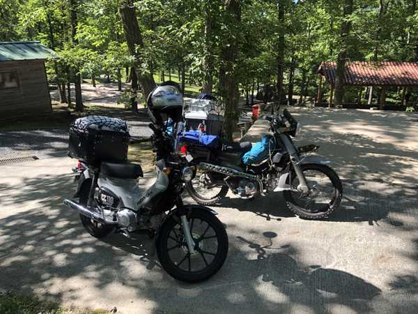 久し振りにエアコンの無い環境で涼しい一晩を過ごし、爽やかな朝を迎えた。時刻は午前5時前なので、静かに起きて洗面をしているとクロスカブさんが起き出して来た。今日も良い天気で暑い一日になりそうだが、キャンプ場の朝は涼しくて気持ち良い。朝食の用意をしようとガスバーナーをセットしていたら、クロスカブさんが焚き火をしようと言うので、リクエストにお応えし、残り火に薪を足してマルチグリドルで卵とハムを焼く。焼き終わったらキッチンペーパーで軽く拭いて湯を沸かしコーヒーを淹れる。フランスパンを半分に切って切り目を入れ、ハムと卵を挟んで朝食の出来上がりである。クロスカブさんは天神峡で作ったハムエッグサンドが忘れられないらしく、この調理が大好きなようだ。今日はオマケにケチャップ付きだ。ゆっくりと片付けを終え、今日の予定を話し合う。クロスカブさんはこのまま帰って仕事をするとの事なので、私はGPS25000で探しておいたオフロードであろう道が3㎞ほど続く白賀渓谷に行って、帰りにクロスカブさんの事務所に寄り、カブ2台で昨年行った滝に再挑戦して帰途につく予定を確認した。サイトを綺麗に掃除し、管理棟の姉ちゃんに帰る旨を報告してカブに跨がる。涼しい県道65号を快調に南下して行くと、何だか見覚えの無い道を走っていることに気づいた。カブを止めてGPS25000で確かめてみると、このまま南下すると久世に行ってしまう事が発覚。白賀渓谷に行くには県道56号に左折しなければならなかったのをそのまま直進してしまったようだ。昨日は目木川と余川の合流地点を大津神社方面に分岐したが、反対側に分岐するとこの県道65号となり、こちらの方が早いと昨夜クロスカブさんに教えて貰っていた。なるほど、地図をみても県道65号経由の方が近道だった。折角下って来た道を引き返し、県道56号へ右折すると見覚えのある風景となった。白賀渓谷は布施神社の参道脇の白賀川に沿って山に入って行くと「白鹿発祥の地白賀渓谷」の標識が現れる。ここからの道は木々に覆われ、沢を流れる水の音と相俟って実に涼やかである。途中にヤマメの釣り堀もあり、天然の釣り場として白賀川にも放流しているようだ。更に進むと開けた草原が現れ、トイレや休憩所、炭焼き小屋が建てられた場所に着く。クルマで来た人はここから渓谷をハイキングしたり、ヤマメ釣りを楽しむ起点となっているようだが、今日は誰もいない。完全ぼっちだ。渓谷へ分け入る道はさらに奥へと続いており、入口に熊出没注意の看板が出ていたので、念のためにリアボックスから熊撃退スプレーを取り出し、腰のベルトにセットして進むと、アスファルトが途絶え予想通り荒れたオフロードになった。今回は電動空気入れは持って来ていないので、空気圧は落とさず、熊との遭遇も考慮して低速で前進する。渓谷を登って行くに従って沢や渕の名所が次々と現れ目を楽しませてくれる。秋には紅葉がさぞかし美しいであろう事が想像出来る。オフロードを1㎞ほど走ると突然鉄製の扉が行く手を遮っており、これより先に進む事が出来なくなっていた。恐らくクルマやバイクが通ると、その音でヤマメが逃げてしまい釣りの妨げになるのではと思われる。GPS25000で位置情報をみると、林道はまだ1㎞ほど奥に延びているようだが、潔くここは引き返す事にした。この川の上流には天然ヤマメもいるようで、釣りをするには白賀川専用の遊漁券が必要のようだ。帰りのオフロードで車体が激しく揺れた為かどうかは分からないが、途中からニュートラルランプが点灯しなくなり、合わせて燃料計が残量0のまま動かなくなった。配線のギボシが外れたのかも知れないが、2箇所同時に壊れるものだろうか。帰ってから総点検が必要だろうと考えながら、白賀渓谷を後にした。県道56号に復帰すると向かいの富総合福祉センターの敷地に1700年代に建てられた旧森江家の住宅が移設展示されているとの事なので、見学した。茅葺きで頭が当たりそうなほど軒が低い建て方は、古代の家の特徴で吹屋ふるさと村の家屋と良く似ている。しかし、この家屋は三方が全て厚い大壁で覆われ、厳しい寒さからの対策が取られいるのが特徴的であるが、三方が窓の無い壁だと中は暗いだろうと想像できる。ゆっくりしていたら、もう11時を回っているので、残り少なくなったガソリンを補充すべく、この辺りで唯一のGSで給油。今回は0.7L入り予備ボトルにガソリンを入れてフロントキャリアに取り付けているので、ガス欠の心配はない。11時30分、クロスカブさんの事務所に到着。このまま滝へ行ってみる事となり、カブ2台で滝に向かう。昨年は途中の空き地にカブを駐めて汗をかきながら歩いて登ったのだが、クロスカブさんは今回はカブで滝壺まで登ろうと言う。前回の記憶では空き地から滝壺までは全て急勾配のオフロードなので、セローかTLR200なら行けそうだがカブではパワー不足だと思った事が思い出されたが、