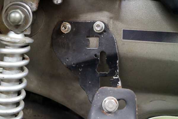 リアブレーキシステムはペダルとロッドを分解してペダルの曲がりを修正の上、錆を落とし、赤サビ転換剤を塗ってブラック塗装で仕上げた。リターンスプリングは、タンククリーナーに浸けて錆を除去して再使用し、車体に取り付けて行く。リアホイールにブレーキパネルを組み込み、これでやっとリアホイールが装着できると思いきや、チェーンアジャスターを忘れていた。このアジャスターは鉄製なので、何故かどの車両のもよく錆びている。予備のアジャスターを取り出してみるも、錆が酷く目盛りも潰れていて判別できない程である。仕方が無いので2号機用のアジャスターをグラインダーで削って錆を除去し、赤サビ転換剤、ブラック塗装したものの、目盛りが見にくいので、アジャスターの山の数で左右を合わせる事にする。これでやっとリアホイールが装着できた。ステップは分解の後、サンドブラストで錆を除去して、ブラック塗装。リターンスプリングは錆が酷かったので新品に交換。スプリングをセットしてステップを装着。固定ピンを押し込んで下からワッシャを入れてピンの穴に割ピンを挿し込んで固定するのだが、穴に割ピンが入らない。何度やってもダメである。穴が潰れているのだろうかと思い、外して細い針金を挿し込んでみたら、穴が詰まっている。細い千枚通しを挿し込んでも貫通しない。どうやら古い割ピンが折れたまま中に詰まって錆びているようだ。これはドリルで揉むしかないので、ボール盤に1.5ミリのドリルを取り付け貫通を試みるも、ボール盤にはドリルが細すぎて折れてしまいそうなので断念。穴が少し大きくなるが2ミリのドリルで慎重に穴開けを行い何とか貫通。やれやれである。やっとリアホイールが装着できた車体割ピン穴が貫通したステップ固定ピンリターンスプリングを新品にしたステップ