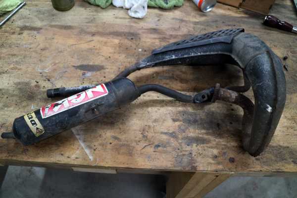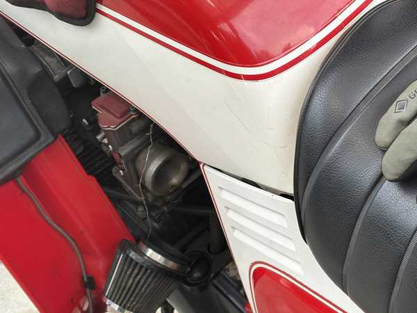 チャンバーはエキパイ部分が赤サビで表面が凸凹になっており、マフラーはNGKとダンロップのステッカーが貼ってあるので、何れも錆落としと塗装面を整えるためにカップワイヤで塗装面を削った。エキパイ部分は曲がりがタイトなので、カップワイヤが届かない。仕方が無いので簡易ブラストで錆を除去する。マフラーを削っていると穴開き箇所を見つけた。直径4ミリ程の小さな穴だが、塞ぐ必要があるので、小さな鉄板を乗せて溶接で塞いだ。グラインダーで溶接跡を削って整え修理完了であるが、このマフラーは両端を溶接で塞いであるので分解出来ない構造になっており、従って中のスチールウールを取り替える事ができないので、バーナーで炙って中のオイルを燃焼させた。すると、穴を塞いだ溶接箇所とピンホールのような穴から少量の煙が出て来たので、2箇所ともハンダで塞いで焼き入れ完了である。チャンバーも念のためにパイプにバーナーを突っ込みオイル成分を飛ばす。冷えたところで、耐熱塗料を吹いて、仕上げにバーナーで炙って艶を出す。これでやっと車体に取り付ける準備が出来た。ガスケットはNBRの新品互換品を取り付け組み上げて行く。チャンバー取り付け袋ナットは何故かメッキ仕様だったが、錆が酷かったので、ブラストして赤サビ転換剤を塗布し、ブラック塗装で仕上げた。1つ1つの部品を取り付けるにも、一々部品やボルトの錆落としから塗装まで行わなくてはならず、作業に時間が掛かるが、段々と組み上がって行く過程がレストアの醍醐味である。錆や汚れのあるチャンバーとマフラーカップワイヤとサンドブラストで塗装面の均しと錆び落としを終えたチャンバーとマフラー穴開き箇所が見つかったマフラー溶接で穴を塞いだマフラー耐熱塗装と焼きを終えたチャンバーとマフラーNBRのガスケット車体に取り付けたチャンバー車体の下側から見たチャンバーチャンバーに連結したマフラー