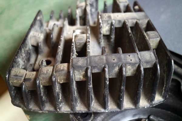 ピストンの部品が届くまでにコンロッドから外したピストンを分解し、掃除をして置く。カーボンで黒く汚れた箇所はあまり手荒な事はしたくないので、ボンスターで磨いた。リングの溝はキャブクリーナーに浸けて柔らかい真鍮ブラシで汚れを除去する。頭に堆積したカーボンはスクレーパーで厚い層だけ除去し、ボンスターで地金が光るまで磨いた。すると、頭の部分に小さな凸凹が見えて来た。普通ピストンの頭はツルッとしているものだが、何故全体が小さな凸凹になっているのか分からない。TLMはこういう仕様なのか?それとも長い間の爆発で変形したのか?2号機のピストンと比べてみたら、こちらも凸凹になっていたので、こう言う仕様かも知れない。ヘッドカバーの燃焼室のカーボンを落とし、ガムテープで養生を行い、プラグホールに詰め物を入れ、フィンの間に挟んである振動止めのインサートラバーを外し、シリンダーも上下のガスケットの部分をガムテープで養生し、簡易サンドブラストで耐熱塗料を剥離する。エンジンフィンの塗装剥離はワイヤブラシでやる人もいるが、この部分はサンドブラストが圧倒的に早く、綺麗に仕上がる。ブラスト後艶消しブラックの耐熱塗料を吹いたら完了である。2号機の塗装済みクラッチ側エンジンカバーに取り替えようと、3号機のカバーを開けてみたら、汚い。クランクケースの底にペースト状の不純物が張り付いており、クラッチのロッドも錆が見える。そこで両機を比較して考えた。2号機の状態⇨ピストンとシリンダーに縦傷あり。スタッドボルトが1本が酷い電触錆、もう1本はナットが固着して回らず、クランクケースからボルトが抜けてしまった。その他の機関は異常無し。3号機の状態⇨エンジン内部が汚い。クラッチロッドに錆びあり。ピストン、シリンダーは無傷。スタッドボルトも錆は無い。以上の事を勘案すると、2号機に3号機のスタッドボルトとピストン、シリンダー、ヘッド等を移植するのがベストな方法だと言う事が導き出されたので、2コ1の作業に移る。先ずはスタッドボルトの移植からである。電触で真っ白に錆びたボルトを抜くためダブルナットにメガネレンチを掛けて力を入れるも緩まない。渾身の力を掛けるとボルトが曲がったり、クランクケース内で折れる事も予想されるので、バーナーで炙ったら何とか緩んだ。もう1本のボルトはクランクケースからは外れているのだが、ヘッドナットが固着して緩まないので、反対側にナットを取り付け、これもバーナーでナットごと炙ったら緩める事が出来たので、3号機の綺麗なボルト2本を抜きに掛かる。こちらはダブルナットで簡単に外す事が出来た。傷の入ったピストンをコンロッドから外し、カスタムジャパンから届いた新品のピストンリングを取り付けるのであるが、SMでは「Nの刻印を上にして取り付ける。」とだけしか表記が無い。セカンドとトップのリングは違うらしいので、ネットで検索すると答えがあった。両リングにRNの刻印があり、刻印を上にして取り付ける。トップリングは断面が台形になっており、セカンドリングは緑色のラインがある。これで謎は解けたのだが、リングにRNの刻印を探すのが大変だった。50ccの細いピストンリングに刻印された小さな細い文字は通常の老眼視力では見える筈も無く、スマホのルーペソフトを使用するもブレて見えない。大きな天眼鏡を持ち出しても確認出来ず、2倍鏡でやっと見えた。困ったものだ。嵌め込んだピストンリングは何れもピストンの溝のストッパーに合い口を合わせる。これがズレるとビストンは絶対にシリンダーに入らない。今回はピストンリングセットを購入したので、セカンドリングの奥に嵌めるエキスパンダも付属していたので、これも新品になる。次はシリンダーの塗装用マスキングを全て剥がし、リードバルブガスケットAを挟んでリードバルブを取り付ける。ガスケットBは廃番だったので、Bを残して外していたので助かった。3号機のリードバルブはガスケットBを誤って剥がしてしまう失敗をしていたのだ。このガスケットは分厚く、リードバルブの部品をセットする穴が開けられている特異な形状なので作成は難しいだろう。排気ポートからマフラーガスケットを外して、インパクトドライバーに装着したワイヤブラシで煤を落としポート内を磨く。作業が終わったら、エアーを吹いてパーツクリーナーで洗浄し、シリンダー内壁にエンジンオイルを塗って置く。いよいよピストンとシリンダーの取り付けだ。ピストンピンも新品にしたのでコンロッドにすんなりと通る。両端のピストンクリップを入れるのに少し手間取ったが、ラジオペンチで何とかセット出来た。クランクケースとシリンダーの間にガスケットを入れてシリンダーをスタッドボルトに通し、ピストンを真っ直ぐに保持して挿入するとセカンドリングまでシリンダーに入ったので、プラハンで微妙な調整のために、シリンダーを軽く叩きながら