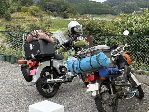 10月21日、クスロスカブさんと吉備中央町にある湯本屋旅館の鷺の巣温泉を堪能し、総社市にある高間キャンプ場でキャンプを行い、江与味の旭川林道を走るツーリングキャンプを実施した。天気予報では、いつの間にか晴から曇りの予報に変わっていて、気温も急激に降下するとの事だったが、雨は降らないようなので決行と相成った。仕事を片付け、カブのリアボックスにamazonで買った265円のDリングを4箇所設置し、テントマットを縛り付けていたら遅くなってしまったので、食材は近くのマルナカで調達し、ガソリンを満タンにして、午後12時30分出発。18日の土曜日がとんでもなく蒸し暑く、家ではクーラーをガンガンに入れていた事もあり、気温が下がると言っても、まだ10月なので冬用のジャケットのインナーを外して走っていたらやたらと寒い。とうとう豪渓の駐車場でカブを止め、長袖シャツを着込んで完全防備で挑むもまだ寒い。インナーを付けて来れば良かったと後悔する。目的の湯本屋旅館には約束の午後2時にやっと間に合う1時55分に到着。クロスカブさんはまだ到着していないようなので、ゆっくりと入浴の準備をしていると、目の前をクロスカブが通り過ぎた。おいおい!何処へ行くの?と追いかけたら旅館を過ぎた辺りで止まっていたので、駐車場に案内する。鷺の巣温泉は吉備津彦命が負傷した際にこの湯で傷を癒したとされる温泉で、湯本屋旅館のみの温泉である。日帰り入浴は全て予約制となっており、今日は2人で2時~3時まで1時間貸切としており、入湯料は1人1,000円だ。浴室は岩風呂のような造りになっており、泉質はヌルヌルと滑りがある。冷泉なので加温してあるが、源泉掛け流しは湯温も丁度良く冷えた体は何時までもポカポカになり、非常に素晴らしい温泉であった。庭付きの座敷もあり、雪の降る日に宿泊して一杯やるのもおつな物であろう。高間キャンプ場の水場の水は飲めないようなので、旅館の女将に水を分けて貰って、カブのベトキャリに積載し、出発。県道78号線の大和郵便局手前を右折し、県道306号線に分岐すると道はいきなり細くなり、山間部に入って行く。クルマが通行できる幅はあるものの、すれ違いは出来ない。舗装はしてあるが木々に覆われた暗い山道はクネクネと蛇行し、落ち葉や苔が生えている。長い山道を抜けると集落が現れ、下って行くと魔法神社があるので、ここで右折して高間キャンプ場方面に向かう。最初の内は少し広いがこの道も段々と狭くなり、木々に覆われた暗い道となり、高度を上げて2つの分岐点を過ぎ暫く走ると高間キャンプ場に到着である。下の段は広場と炊事棟や水場もあるが、このキャンプ場は更に坂を登り展望が開けた芝生サイトが人気である。今日は平日でしかも、曇りで寒いので、こんな日にキャンプをする好き者は恐らく誰もいないだろうと思っていたのだが、サイトの一番奥にテントとクルマが見えた。先客が1人いるようだ。早速中央のフラットな芝生にテントを設営し、宴会場の準備をしていると、クロスカブさんがまたしてもテント設営に苦労している。クロスカブさんのテントはヒロシがぼっちキャンプで使っている物と同タイプものなので、設営は簡単な筈なのに、まだやっている。今日は手伝いはしません。やっと設営したテントにテントマットとシュラフを運び込むのだが、何故かシュラフは丸めてリアボックスの上に縛り付けてある。あの噂の毛が生えた温々シュラフだ。どうしてシュラフ袋に入れて来なかったのかと尋ねると。自慢げにこれはシュラフでは無く、両手が出せる袋のような布団だと言う。従って収納袋は付属していないので、カブに積んで走っていたら汚れるし、雨が降ったら布団がずぶ濡れになってしまいそうである。どうして素直にシュラフを買わないのか。クロスカブさんの脳の仕組みがよく分からない。先客は流星群を見に来たと言っていたが、今夜は雲が厚く星空は絶望的だろう。焚き火用の薪を拾っていたら大きな猿が1匹出て来た。人に慣れているようで、近くに行っても逃げない。先客さんが言うにはこの猿はキャンパーの食材を荒らしに来るようなので、宴会後の片付けはしっかりしておく事にする。クロスカブさんが寒いと言うので、焚き火台に火を入れる。寒い県北から来たのに、いつものジャンパーではなく薄着をしているとの事。なんで?オマケに椅子も持って来るのを忘れたとの事で、大きな割り石を拾って来て、ハンカチを敷いて椅子としていた。落ち着いたところで、先客さんに眼下に見える水島や玉島、瀬戸内海や四国の説明を聞きながら冷えたビールを飲む。クゥ~。美味い。と飲んでいると、岡山から喫茶店の店主がやって来た。今日は3組、4人のキャンプになりそうである。このキャンプ場は総社市となっているが、高梁市に限りなく近く、標高は553m。眺望良好で芝生、東屋、トイレ完備で薪は拾い放題。また、ネットで利用報告をするだけで無料とは片岡市