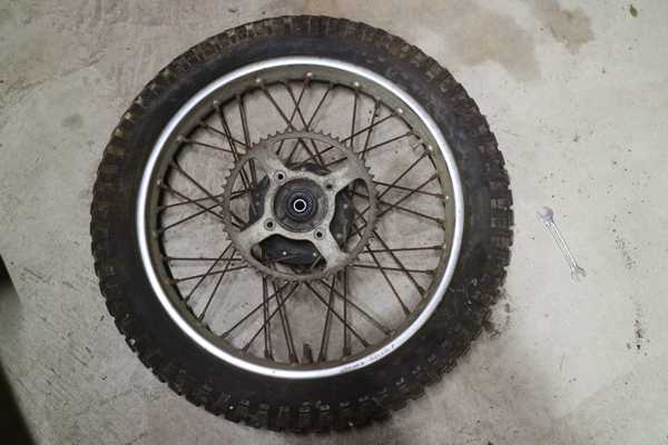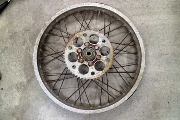 2号機のリアホイールは純正の1.85/18のスチールホイールだ。スポークは真っ赤に錆ているが、リム部分は深刻な錆は見当たらないので、磨き直してこのホイールに純正サイズの3.50/18のダンロップタイヤを履かすか、フルサイズの4.00/18のIRCタイヤを履かすか、決めかねている。スポークは全て上手く外す事が出来たら、錆を落として塗装後、再使用するつもりであったが、タイヤを外してみたら、大変な事になっていた。このタイヤは古いが一見、山もまだ残っており意外と綺麗だったので簡単に外れると思いきやタイヤレバーをミミに引っ掛けるだけで苦労した。汗だくだくでミミを20センチほど外して驚いた。ビード部分が錆で真っ赤に染まっており、ホイールの中はジャリジャリと嫌な音がして、錆の塊が転がり出て来た。タイヤも固着してこれ以上外す事が出来ないので、再使用どころの話しではない。直ぐさまグラインダーを持ち出し、ワイヤーを切断して何とかホイールから外す事が出来た。チューブもリムバンドも酷い有様だ。今までで最悪のコンディションである。外したホイールをよく見てみると、内側全体に錆はあるが、特に雨水に浸かっていたであろう箇所は激しい錆で貫通穴が開いている始末だ。流石にこれは使えない。廃棄処分するしかない。この瞬間にリアホイールを探さなくてはならなくなった。錆の酷い箇所は当然スポークも酷い状態で、ニップルが緩むとは到底思えないが、ダメ元でバーナーで炙ってみたがはやり緩む気配も無い。リム内はニップルが変形するほど錆びているので、外す事は出来ないであろう。ネットで調べてみても、再販品は全て販売終了となっている。中華品は多数あるが、何れも汎用品なので、長さと太さが合っても首の角度が分からないので、手が出せない。PLを見るとスポークAとスポークBと明らかに品番も異なっているので、矢張り首の角度が異なっているのだろう。取り敢えず何本まともに外せるか頑張ってみるが、お先真っ暗である。一見綺麗に見えるホイールとタイヤタイヤを外したホイール(これでも綺麗な箇所)ワイヤを切って何とか外したタイヤ穴が開いたホイールの外側酷い錆で穴が開いたホイールの内側