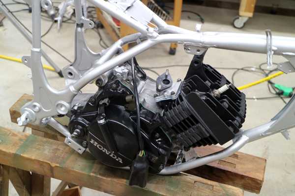 エンジンの組み立てが終わったので、先にフレームに取り付けて置く。エンジンの搭載は前後のホイールを取り付けた後にやる方法と、裸のフレームに先に取り付ける方法とがあるが、エンジンを横に寝かせてフレームを被せるのであれば、先に取り付けた方が良いだろう。このTLMは50ccの軽いエンジンなので、ナメて掛かっていたら、フレームに2箇所傷が付いてしまった。後で補修して置く。このエンジンを乗せるポイントは予めシリンダーヘッドを外して置き、後部上のカラーが付いているフランジボルトから通すと自ずとエンジンが正しい位置に座る。振動止めのインサートラバーは水洗いの後、アーマーオールを付けて黒の艶出しを行い、エンジンフィンに取り付けた。次はステアリングステムの組立てに掛かる。ステムとトップブリッジはアルミ製なので、錆びないのは良いのだが、トップブリッジは塗装の劣化が著しいので、ブラストで塗装を剥離したのだが、アルミ地の上から直に塗装すると剥離し易いので、ミッチャクロンを吹くのが良い。しかし、こんな小さなパーツにエアーガンを使用するには準備と片付けが面倒なので、アルミ地にも使用可能との表記があったプラサフの缶スプレーを使用した。ステムの塗装は劣化が殆ど見られなかったので、クリーニング及び脱脂の後、黒色缶スプレーで塗装の上から塗装した。上下のレースに付いた古いグリスを拭ってみると、ボールベアリングの打痕も無く綺麗な物だったので、再使用する事にした。外しておいたボールベアリングの汚れを取って新しいグリスを塗ったレースに置いて行く。ボールのサイズは上下共同じで、個数も同じ21ヶずつだ。ステムをフレームの下から通し、トップスレッドを締めて仮留めして暑いので本日の作業は終了とする。フレームに搭載したエンジン(右側)フレームに搭載したエンジン(左側)汚れと塗膜の劣化が著しいトップブリッジブラスト後のトップブリッジ汚れはあるものの塗装の劣化は殆ど見られないステム塗装後のステムとレースの状態グリスとボールベアリングを置いたステム上部のレースの状態グリスとボールベアリングを置いたフレーム側ステムを取り付けたフレーム