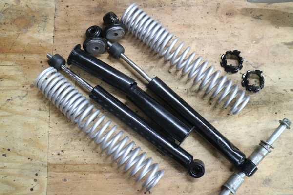 リアサスのスプリングもフレームと一緒に塗装しておいたので、組立てに掛かる。ダンパーとスプリングアジャスターの塗装が浮いている箇所をナイロンディスクで削り、錆を除去して赤サビ転換剤を塗って、ブラック塗装の後クリアを吹いて置く。アッパージョイントはアルミ製なので、軽く磨いて古い塗装を残したまま、上塗りを行う。リアサス取り付けワッシャーはメッキだが赤錆が出ていたので、除去しようとしたが、中央が凹んでいる形状なので研磨道具の手が出せない。小さな部品なのでサンドペーパーで手磨きするのも難しいので、木材の端材の上に置き、中央のボルト穴にビスをねじ込んで固定した上で、電動ワイヤーブラシでギュイーンと回すと1発でピカピカのワッシャーに戻った。メッキも少し剥げただろうから、グリスを薄く塗っておいた。部品の化粧が済んだので、組み立てて行く。ダンパーロッドを最長になるまで伸ばし、ダンパーにスプリングアジャスター、プラのスプリングガイド、スプリングの順番で通すのだが、スプリングは密になっている方が上部になる。最後にアッパージョイントをダンパーロッドにねじ込むのだが、力技では難しいので、ここで簡易スプリングコンプレッサーの登場となる。手持ちのアクスルシャフトにカラーを2つ通し、ターンバックルのフックを掛け、もう片方のフックにナイロンロープを括り、スプリングにもう片方のロープを括れば完成である。左右のターンバックルで締め込んで行くとスプリングが縮みロッドが出て来るのでアッパージョイントをねじ込む。簡易コンプレサーを分解し、スプリングからロープを解き、スプリングの隙間から14ミリの薄型スパナを挿し込み、ロッドナットを押さえアッパージョイントを最後までねじ込み、薄いスクレーパーを利用して、ストッパーラバーをナットに嵌め込むと組立て終了である。車体に取り付けると一層バイクらしくなって来た。塗装が完了したリアサスの部品簡易スプリングコンプレッサーでアッパージョイントをねじ込んだサスフレームに組み込んだリアサス安全な作業台に移しバイクらしくなって来た車体