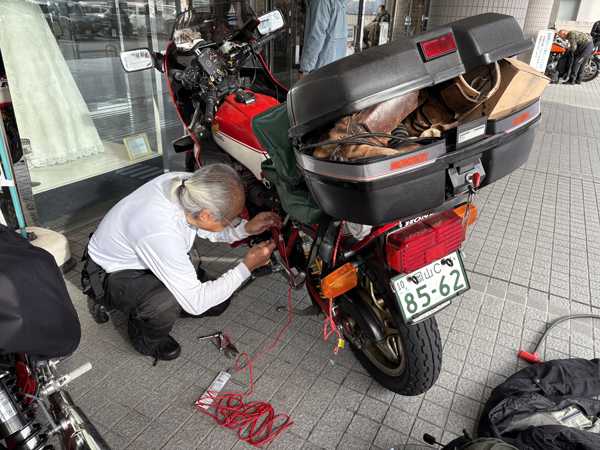 ハーレーさんがどうしても行ってみたいとリクエストのあった柏島ツーリング。夏からディアベルさんが綿密な計画を立て11月5日、6日の両日に決定していた。しかし、1週間前から両日だけ雨予報が続いており、3日前になっても変化無し。決行するかどうか迷っていると2日前になって山陽側は晴れに変わり、四万十市辺りは夕刻まで曇り夜は雨、翌日は晴れに天気が回復したので、満を持して決行する事にした。ディアベルさんは講演予定の失念が発覚し、当日単独でホテルまで駆けつける予定であったが、突然病魔が襲い不参加となった。ルマンさんは仕事が入り急遽不参加を表明。結局ハーレー、BMW、ボルドール、ゼファー、V7の5台の参加となった。何時もの先導車ディアベルがいないので、今回はV7が先導役となる事は予め分かっていたので、V7にクアッドロックの互換品スマホフォルダーを取り付け、インカムとスマホのペアリングも済ませ先導役の用意を行っておいた。集合場所の道口PAに出発時刻7時30分の15分前に到着してみると、ボルドールとゼファーが既に到着し、駐車スペースに工具を並べ店を広げている。何事があったのかと聞いてみると、電圧が11.5V程度に落ち込んでおり、充電ができていないとの事。昨日、燃料を満タンにした時には異常がなかったとの事なので、今日になって壊れたようだ。出発時の午前5時30分は気温4度で、寒さで電圧計が曇って見えず、異常に気づくのが遅れたそうだ。充電ができていないとなると、ライトも使っているだろうし、セルでの始動は難しくなる。最悪、走行中にエンジンが止まるかも知れない。故障箇所として考えられるのは、ダイナモとレギュレーターだが、確率からしてレギュレーターが濃厚であるように思われる。ダイナモを調べてみるべく、ソケットを探したが8ミリだけ無かったので、カバーが開けられない。配線を調べたり、測量士の師匠に電話して善後策を検討した結果。もう暫くは走れるだろうという結論に達したので、BMWに今治にあるバイク屋かカー用品店の検索を依頼すると運良く、ルート上に今治のオートバックスがあるのが分かったので、バッテリーはそこで調達し、途中でエンジンが止まったら、小型高性能チャージバッテリーに繋ぎ急場を凌ぐ事にした。しかし、ボルドールさんのトランクの中には何でも入っている。長年、付きあっていたバイクなので、全ての事に熟知しており、もしものために最低限の修理器具も揃えてあるのが素晴らしい。あれこれやっていたら、出発時間が大幅にずれ込み既に予定より50分遅れとなっていた。今日はかなりの距離を走らなければならないので、時間は1分でも節約したいのだ。店を閉じて皆さん出発準備を整え、エンジン掛けたら、BMWさんがいないのに気が付いた。売店に探しに行ってみると、お盆の上にうどんを載せて席に運んでいるBMWさんに遭遇…。この状況で今食べるか?朝食を終えたBMWさんが揃ったのでやっと出発。ボルドールは重傷なので、先頭V7、次は非力なBMW、中央にボルドールを挟み、次はハーレー、最後尾にベテランのゼファーの布陣を組んで、高速をしまなみ海道に向けて走る。ボルドールはバッテリーの消耗を防ぐためにライトもウインカーも点けないので他のクルマに見えないように隊列の中央に常に挟み込んで置く。今治まで止まりたくなかったが、ゼファーとハーレーの給油のために、いきなり福山SAで停止。ボルドールはエンジンを掛けたままだ。山陽道からしまなみ海道に分岐し、島づたいに瀬戸内海を今治に向けて常にバックミラーでボルドールの状態を見ながら只管走る。何とか大丈夫のようだ。オートバックスの開店は午前10時なので、場所の確認と寒いのでトイレ休憩で予定外だが、来島海峡SAに停車。時間の節約のためヘルメットを被ったまま待っているとBMWが帰って来ない。聞いてみるとソフトクリームを買って食べているとの事。何で今食べるのか?再出発して、今治ICまで走り、高速を降りたら今度は私のYahoo!ナビが誤作動を起こし、右折箇所を1本間違い、ゆめタウンの駐車場でUターン。大通りの信号でハーレーとゼファーが渡りきれず迷子となった。2台は反対方向に走っていたようで、電話でやっと連絡が取れた。ボルドールとBMWは先にオートバックスに向かって貰い、バイクを降りて交差点でハーレーとゼファーが来るのを待つ。今回は私のミスだ。更に時間がオーバーする。オートバックスに到着すると、ボルドールが軽四用のバッテリーやら配線を買って来たところであった。取り付けを手伝おうとしたら、BMWさんが給油に行くというので許可したら、ボルドールさんが配線作業に時間が掛かるので、新品バッテリーはあるし、昼の食事場所でゆっくりやりたいとの事。慌ててBMWを呼び戻そうとしたが、聞こえず給油に行ってしまった。時間が…と心配したが、ボルドールの片付けが終わると同時に帰って来た。R196を暫く走り、今治湯ノ浦ICから松山道