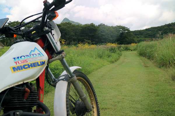 本日8月15日、午前5時30分、整備が終わったTLR125Sを駆って、蒜山・大山車中泊ツーリングに万全を期すべく、テスト走行に出掛けた。行き先は玉野市田井に鎮座する日吉神社だ。昨日、知人の八浜に住む尾崎氏が尋ねて来て、話しをしている内に明日午前6時から、世話役と日吉神社の参道の整備に行くが、四駆の軽トラかジムニーでないと行けない凄い所なので一度見に来て欲しいとの要望があった。確かこの神社は笏取り虫会員のトリッカーさんが以前行こうとして道が分からず断念。再度トライしたもののバイクを倒して新車のタンクを大きく凹ませた神社である。話しには聞いていたがかなり難易度が高い神社であろう事は間違いない。そうなればどうしても幻の日吉神社に行ってみたくなり、尾崎氏には明日の夕方に行くと告げていたが、待ちきれなくなり、朝の5時30分に出発となった次第である。リュックに、凍らせたペットボトルとナタ、電動空気入れを入れ、携帯ホルダーをカブから移設して、エンジンを掛けようとしたが掛からない。チョークを引いて何回キックしても掛からない。昨日、GSにガソリンを入れに行った時には一発で掛かったのにどういう事だ。今日は幸先が悪い。それとも「行くな!」というサインだろうか?リュックを降ろし、ヘルメット脱いで玉の汗を流しながら20回ほどキックした所でようやくエンジンが目覚めた。5年前のガソリンに新しいガソリンを混ぜたのでエンジンがビックリしたのだろうか?暖機を済ませるとアイドリングも安定している。早朝なのでゆっくりとスタート。朝の空気は気持ちが良い。今日は盆なのでクルマも殆ど走っていないし曇り空なので、丁度良い。日吉神社に行くルートは3通りあり、尾崎氏は八浜から入ると言っていたので、こちらは田井から挑戦してみる事にした。田井の街に着いた所でバイクを止めて、GPS25000の位置情報をONにする。ここからはGoogleMapにも表示されない山道なのでGPSが頼りだ。脇道に入ってから山道をグングン登って行く。125ccの非力なエンジンなので、ギアを落としてアクセルを開けるとマフラーの熱がお尻の辺りまで伝わって来る。十禅寺山登山道の手前で道が分岐。木製の小さな板看板に日吉神社とあったので、間違いない。ここからはオフロードだが、50mも進まない内に道幅が40cmほどの獣道になり、竹林の中に入って行く、昔はこの辺りに集落があったようで、崩れた家や石垣が竹林の中に確認できる。更に進むが道は段々細くなり、枯れた孟宗竹が行く手を阻み、もう道なのか何なのか分からない状態となった。徒歩でも通行不能な廃道となっていることが分かったので断念せざるを得ない。しかし、引き返すにもUターンは無理なので、少しずつバックで帰るしか手立てがない。やはりすんなりとは行かせてくれない幻の日吉神社。こうなると、次は大藪港からのアタックだ。GPSによると民家の間の道を登って行くようになっているが、この道が50cmほどの畦道でとても道とは思えないような通路であったが、GPSの地図にはちゃんと載っているのが凄い。流石国土地理院だ。小川沿いを登って行くと、舗装路に合流したので、初めからこの道を通れば良かったのであろう。更に進んで行くと、格子状の柵で道が塞がれていた。近づいてよく見てみたが、開ける事が出来ないように針金で縛ってあったので、ここも断念せざるを得ない。イノシシ除けと思われるが、この道を通って日吉神社に行く人は1人もいないのであろう。こうなったら最後の手段で、八浜からのアタックを試みる。GPSの通りに進んだら、これも小川沿いの草ぼうぼうの畑の畦道のような細い獣道となったが、結局県道に合流。合流地点には下池と呼ばれる池があり、その土手を渡るとコンクリート道、更にオフロードとなり、急坂のガレ場となったので、バイクを止めてタイヤの前後の空気を1気圧程度まで抜く。スタンディングでガレ場を抜けると、今度は笹が生い茂り、道が見えない箇所が数カ所。問答無用で突っ込み何とかクリア。倒木を踏み越え、頭上から垂れ下がった蔓植物を掻き分け、急坂を駆け上り、ヘルメットと顔が蜘蛛の巣だらけになりながらも、只管幻の日吉神社を目指すと、小さな日吉神社の道標を確認。もう少しだと思いきや、前方に倒木が見えた。しかも倒れた杉に大きな桜が覆い被さり共倒れとなって道を塞いでいるではないか。リュックのナタを取り出しても歯が立たない大物なので、チェーンソーがないと無理であろう。ここで万事急須か。しかし、諦め切れないので、坂にバイクを止めて歩いて現場検分を行うと、杉の倒木の根元付近の斜面にタイヤの幅ほどの隙間があるのを見つけた。渾身の力で桜の枝を除けて、スタンディングのまま狙いを定めてフロントタイヤを隙間に入れてアクセル全開で何とかクリア。たぶん今日一の難所だろうと安堵したとたんに、今度は行く手を阻む背丈程もある雑草が続いていた。道は全く見えないの