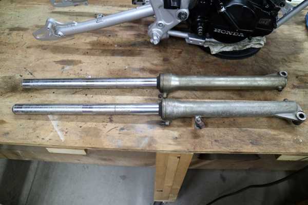 フロントフォークの肝は、やはりインナーチューブの状態だ。旧車やオフ車などはフォークブーツが付いているものがあり、水から守られるので、経年車体でも比較的綺麗な物が多いが、ブーツがない車体だと大抵サビが出いている事が殆どだ。TLM50はフォークブーツが付いていないので、2号機のインナーチューブも例外ではなくサビが出ている。しかし、幸いな事に全体に錆びがあるが、摺動部のサビは僅かであったので、何とか再使用出来そうである。それと、左右共オイルシールが生きており、奇跡的にオイル漏れもない。本当は、予防的措置としてオーバーホールを行うのが良い事は分かっているのだが、オイル漏れが無い部品を交換すれば費用が嵩むので、今回は見送る事にした。1号機のアウターチューブはバフ掛けを行い、アルミの地肌をピカピカに仕上げ、クリヤを吹いておいたが、経年によりアルミが錆びて来たので、2号機はナイロンディスクやボンスターで磨いた後にプラサフ、シルバー塗装、クリヤと吹いて仕上げた。インナーチューブは、ナイロンディスク、ボンスター、ビカールで磨いて、最後は青棒を塗ったバフで仕上げた。小さな凹みは残ったが、よく見ないと分からない程度に収まったので、何とか使えるだろう。ステムとトップブリッジに取り付けるボルトは4本共真っ赤に錆びていたので、YouTubeに習いバーナーで炙ってみたが、綺麗にならないので、ナイロンディスクと丸砥石リューターで磨いて、赤錆転換剤を塗って仮止めした。錆びたトップナットは後で部品取りフォークの程度の良いものと取り替えて置く。左右のフロントフォーク磨き前と後のアウターチューブ塗装後のアウターチューブインナーチューブの錆の状態磨きが終わったインナーチューブインナーチューブの拡大画像フレームに取り付けたフロントフォーク