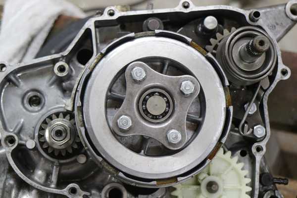 折角エンジンカバーを開けているのだから、クラッチを点検してみる。プライマリードライブギアとクラッチアウターギアにウエスを嚙ませて回り止めを行い、ボルトを緩めてクラッチスプリング4本を外す。センターボルトのEクリップを外すとディスクにアクセスできる。各ディスクは張り付きも無く、フリクションディスクの厚さは3ミリ(限界値2.7ミリ)、スプリング長31ミリ(限界値30.2ミリ)何れも問題ない数値であり、非常に綺麗だったので交換しているのかも知れない。外した逆順で元の通り組み立てて、点検完了である。ノックピン2箇所にガスケットの穴を通し、エンジンカバーを取り付ける。SMには規定トルク表記が無いので、手トルクで締めた。非常に綺麗なクラッチの状態リフタープレートを外したクラッチ