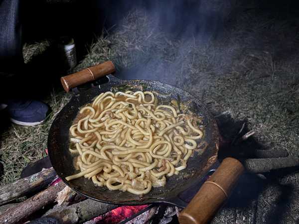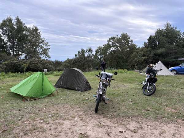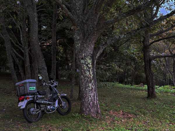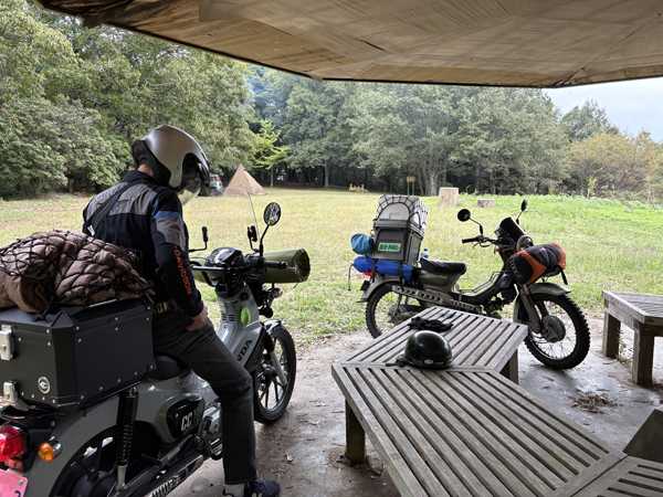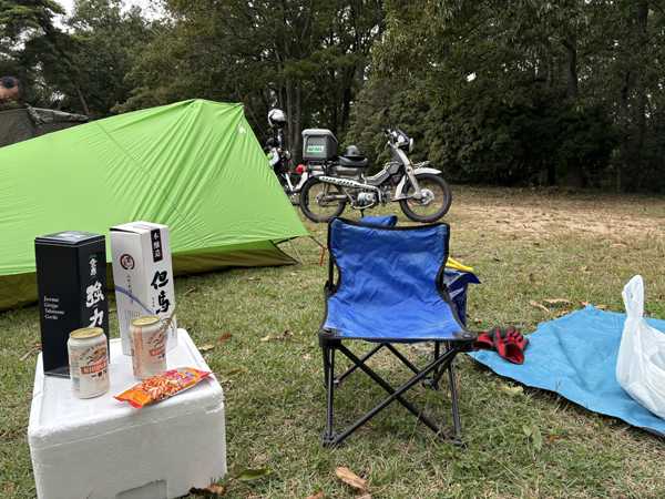 やっと設営したテントにテントマットとシュラフを運び込むのだが、何故かシュラフは丸めてリアボックスの上に縛り付けてある。あの噂の毛が生えた温々シュラフだ。どうしてシュラフ袋に入れて来なかったのかと尋ねると。自慢げにこれはシュラフでは無く、両手が出せる袋のような布団だと言う。従って収納袋は付属していないので、カブに積んで走っていたら汚れるし、雨が降ったら布団がずぶ濡れになってしまいそうである。どうして素直にシュラフを買わないのか。クロスカブさんの脳の仕組みがよく分からない。