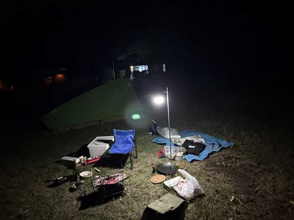 早速中央のフラットな芝生にテントを設営し、宴会場の準備をしていると、クロスカブさんがまたしてもテント設営に苦労している。クロスカブさんのテントはヒロシがぼっちキャンプで使っている物と同タイプものなので、設営は簡単な筈なのに、まだやっている。今日は手伝いはしません。