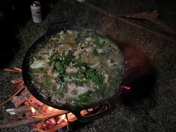 今日の酒宴はモツ鍋である。モツはクロスカブさんが用意するとの事だったので、スープと後の食材だけ持って来た。クロスカブさんがモツは前回の天神峡キャンプで少し少なかったと思ったので200g増量して600g買ったと言うが、2人で600gはいくら何でも多すぎるだろう。しかし、買った物は仕方ないので食べ切る事にするしかない。マルチグリドルにスープを入れて、シメジ、キャベツ、玉葱、モツを入れて煮る。最後にニラを投入すればモツ鍋の完成である。酒はクロスカブさんが持参した純米吟醸「強力」720mlと本醸造「但馬」720mlだ。