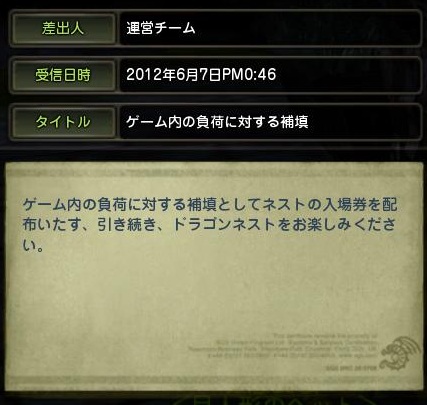 また何日も放置してしまった(゚д゚)!お久しぶりです、鎖の子です。何だかハンゲさん、どこかしらから攻撃されてるようですね(´・ω・`)満足にネストもいけないよービエエェェ。゚(。ノωヽ。)゚。ェェエエン!!!7日にお詫びとしてSDとGDの鍵とHCの鍵を送付してきたけど、これじゃあ釣り合わないよね?普通に町にいるだけで落ちるし(´・ω・`)、はやくなんとかして貰いたいものですorzそうそう、その送付してきたメールの文章が面白かったのでSSしちゃいました.+(*つ∀≦*)+.入場券を配布いたす(キリッギルメンの皆と一緒に爆笑させて貰いました゚:+((*′艸`))+:。そして!ついに!雪のれべるが40になりましたー+.゚(*´>ωω