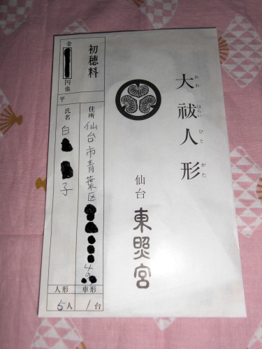 今日も木枯らしが吹く寒い日でした。仙台宮町の東照宮から年越の大祓のご案内がきてたので人形(形代)に家族5人個々の名前を書いて初穂料を入れて申し込んできました。年越の大祓いとは、12月31日、今年一年の心のけがれ、身体のけがれ、その他の災いを祓い清め、さわやかな心と身体で新しい年を迎える神事です。東照宮駅の踏切で仙山線の山形行き電車を写しました参道の登り口から写した神社年越の大祓いの看板ですお参りする人も無く静かな神殿 狛犬さんも一年の汚れを洗い清めビニールをかぶせられ新年を待っていました 我が家でも新しい年を迎える準備が出来ました来年はどんな年になりますか??宝くじ当たらないかな~