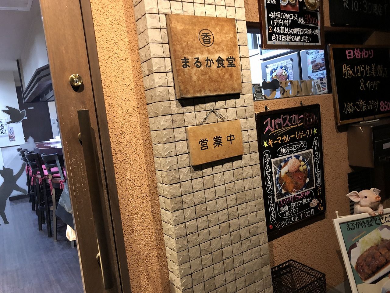 ちなみにポークチョップは骨付きの豚肉を焼いたものを言います。ひー様はポークチャップが好きです。【まるか食堂】てなことで、ポークチャップを出す店って少なくとも京都であまり知らないんだけど、この店にあるもんだから来てみました。定番のサントリーモルツです。京都にはサントリーのビール工場があるので、モルツを出す店多いですよね。出てきました!ポークチャップです。ひー様が昔食べていたポークチャップとはまた違いますが、これはこれで美味しいです。小学生のころを思い出しますね。当時はひー様にとってごちそうでした。昔ポークチャップを食べていたその店は、今もありますが残念ながら今は提供していません。これからは自分で家で作ってみて、ふみふみに食べさせるかな?まるか食堂Facebook