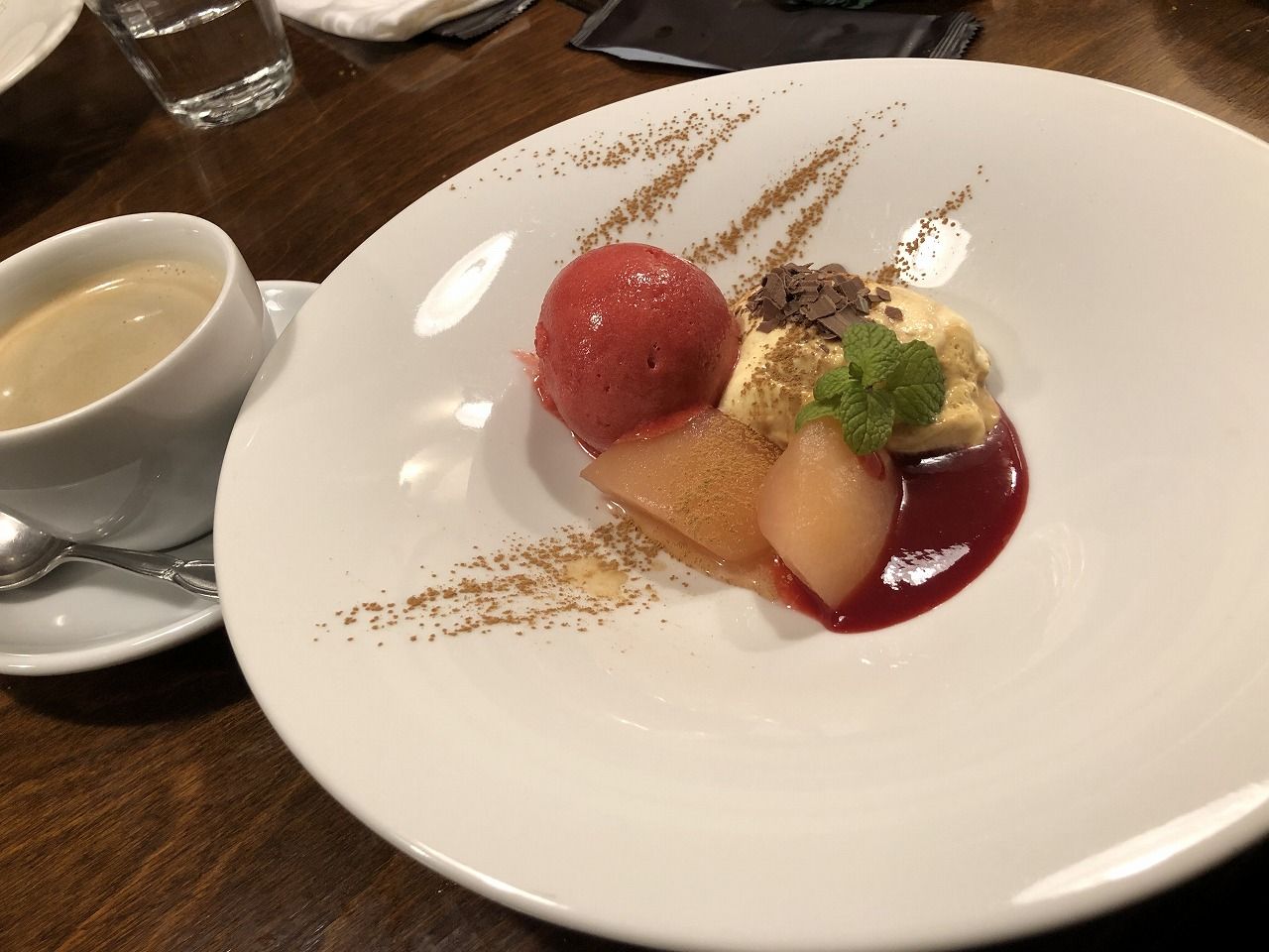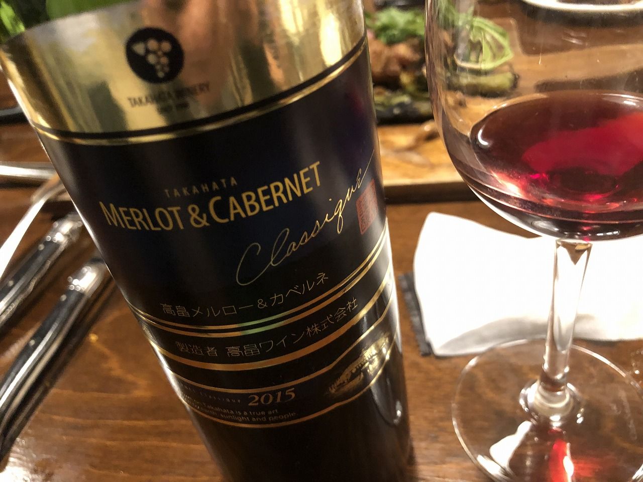 肉には赤ワイン!高島クラシックという高島ワイナリーと言う日本のワインですね。最後にデザート出てきて終了ですね。