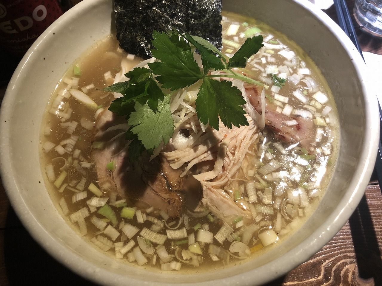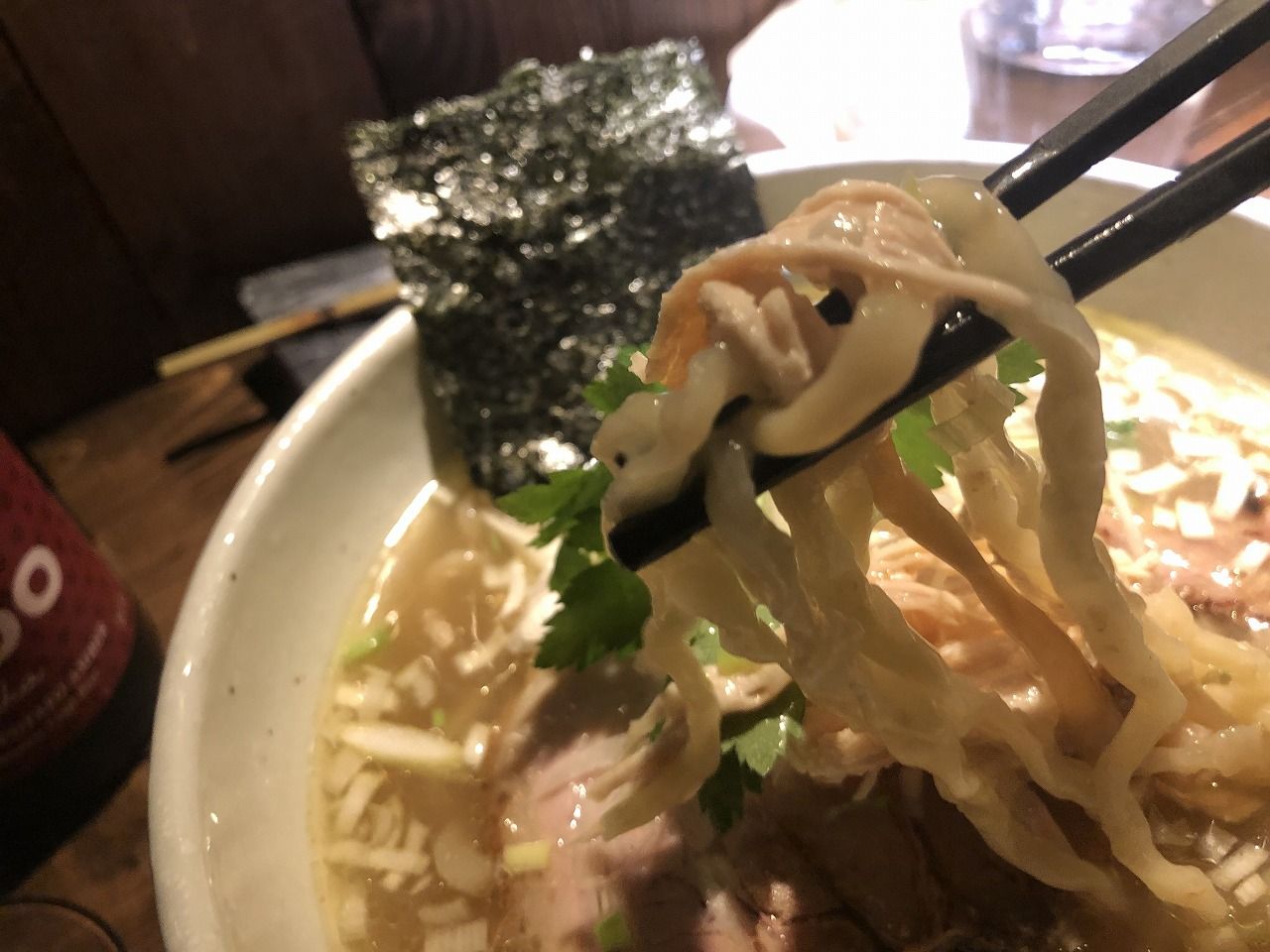 塩味でアッサリした味わいです。麺は平打ち麺ですね。鶏の風味もして〆には良い鶏蕎麦でした。