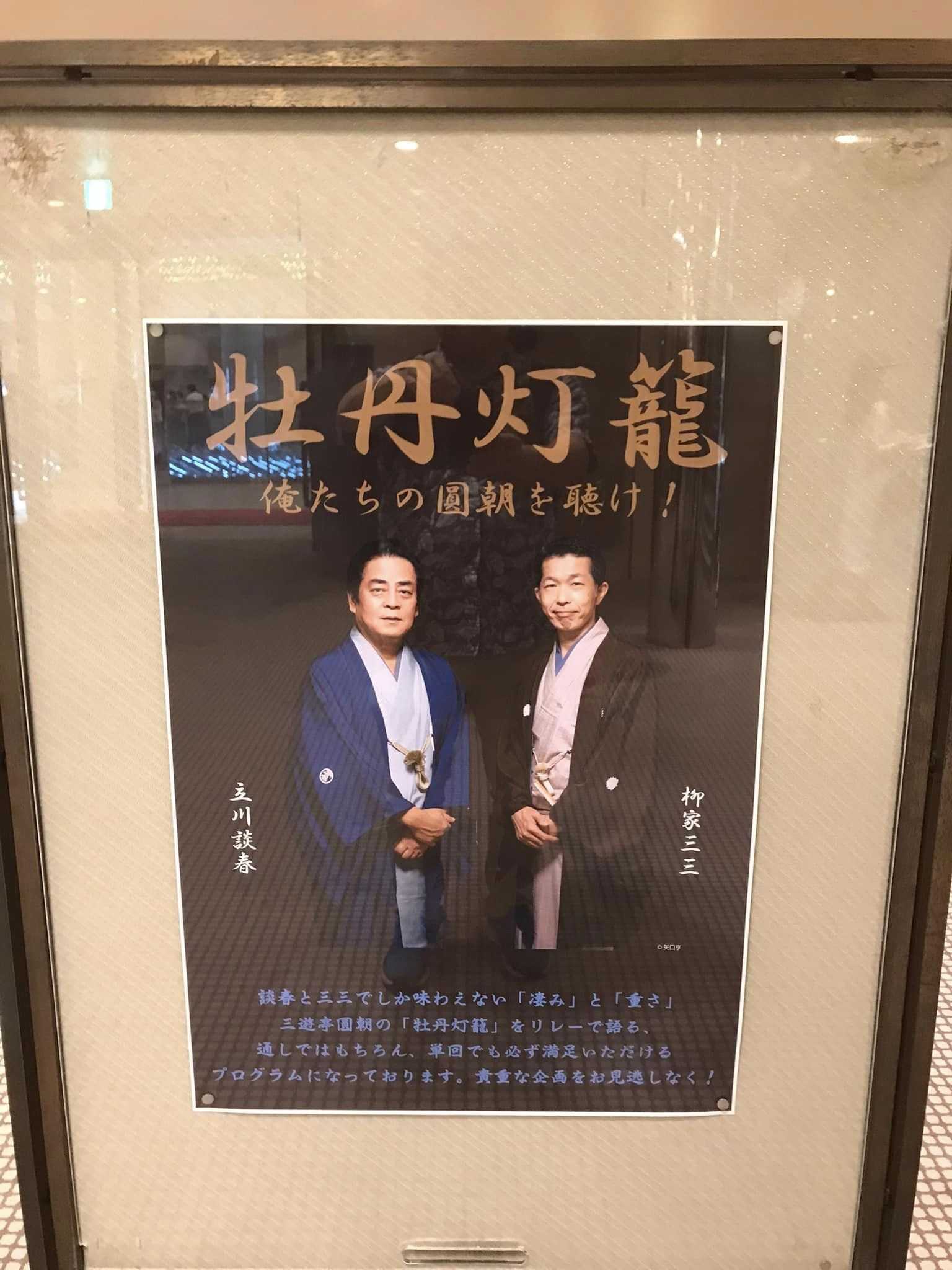 本日も三三さんと談春さんの牡丹灯籠を聴きに有楽町朝日ホールに参上!9/3(日) 俺たちの圓朝を聴け! ~牡丹灯籠~ 1回目演目:■ごあいさつ /談春・三三■宮戸川/三三■お露と新三郎 ~三崎村まで~/談春<仲入り>■三崎村からお札はがし~お米談判まで~ /三三■粗忽の使者/談春■ごあいさつ /談春・三三参考)圓生 牡丹燈籠1