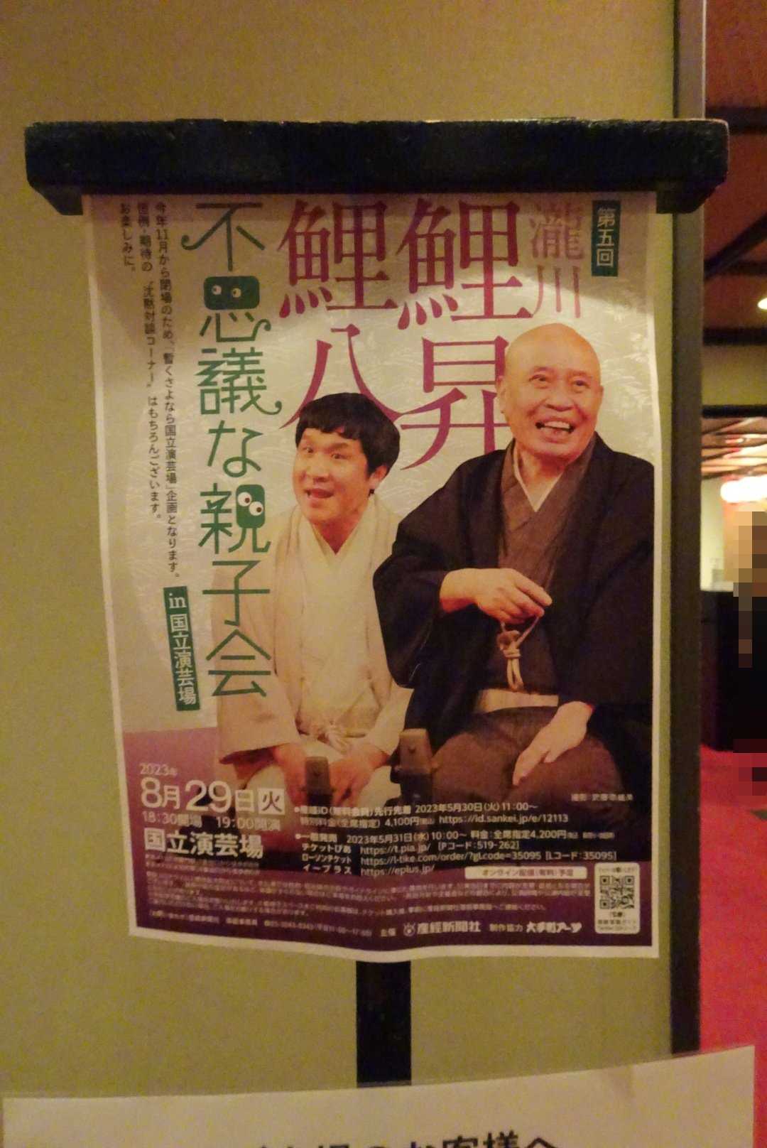 2023年8月29日(火)第五回 瀧川鯉昇・鯉八 不思議な親子会 in 国立演芸場一.沈黙対談コーナー一.「道灌」辰ぢろ一.「最後の夏」鯉八一.「船徳」鯉昇-仲入り-一.「にきび」鯉八一.「蛇含草」鯉昇