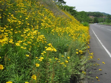 御浜町の県道の法面に一面黄色いお花が毎年咲くのですが、恥ずかしい事に名前を忘れました昨日は風邪が治らず、休日診療所(旧熊野福祉センター)に行った時に偶然 写真のお花の咲いている近くに住んでいる方も診察に・・・・ しかし、お花の名前を聞くことを忘れて残念逆に神社の祭事の関係を聞かれて 説明途中で私が診察室へ・・・それっきり 熊野市と御浜町の境 菊仲間かな? 御浜町の田んぼの土手にもところどころで咲いています きれいです熊野市内のR42号線歩道部分に植えられているお花もきれいですが私は自然のお花のほうが好きです