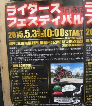 昼前、自宅にいるとオートバイのエンジン音がやかましいのです休日出勤の午後までに所要を済ませようと 町内を走っていたら三重県熊野防災拠点に車や人が大勢いるのですね エンジン音の発生源が判明拠点に近づくと片側車線に車がいっぱい 交通警備員さんが何か合図(無視)拠点まで車 今度は誘導員さんの目 少し愛想が悪かったですが、無理を言って2分だけ路肩駐車してみてきましたライダースIN南紀フェスティバル 後援が熊野市市民の方は知っていたのかな 私は知りませんでした開催趣旨は地域の活性化だそうです 午前中、小雨でしたがお客さんが多かったです写真編集時に分かったのですが 新姫ちゃんトランポリンもあったようですそれにしても熊野はイベントが多いものです