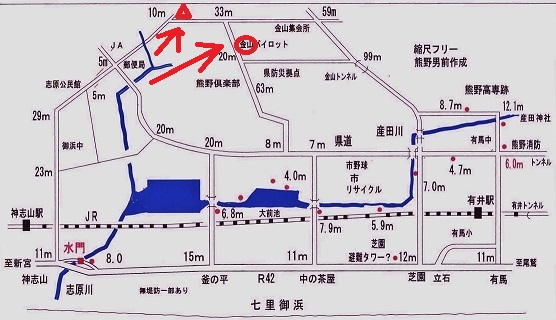 東海、東南海、南海地震によって津波が発生した場合の心配を日記に書いてきました避難に問題途中にかかる橋改修や津波避難タワーの建設が望まれるからです御浜町と熊野市の境界である志原川(熊野側・産田川)河口の水門の問題も大きいのです崩壊したら熊野市内R42号西側の低地に河口から遡上した津波がそして避難経路をふさぐ可能性が高く橋や避難タワー、水門の改修か新設が望まれるのです 今回は西側でなく志原川から熊野市金山町に遡上が懸念される事を書きます 簡易図の矢印周辺が下の写真です この橋の海抜は約5m反対方向は河口側になり、郵便局があります 左に橋がみえます 護岸工事中ですねこの道は河口が津波でなく砂利で閉口すると冠水した時が何度かあります上写真の矢印先端の海抜が10mから14m 御浜町の志原です矢印の向こうが熊野市金山と久生屋、御浜町志原の境界付近で金山パイロット事務所近くになるのです金山は津波に大丈夫? 危険区域もあるのですね市の海抜表示が金山町にも必要ではないでしょうか 別件この川は志原川支流の太田川になります別問題ですが、金山町の新興住宅(夢が丘)や 工業敷地建設が計画されている紀州黒しお学園?久生屋のオレンジ跡地の高速道路の廃土(盛り土)熊野倶楽部等からの排水がこの川に流される??それなのに川の浚渫はされません