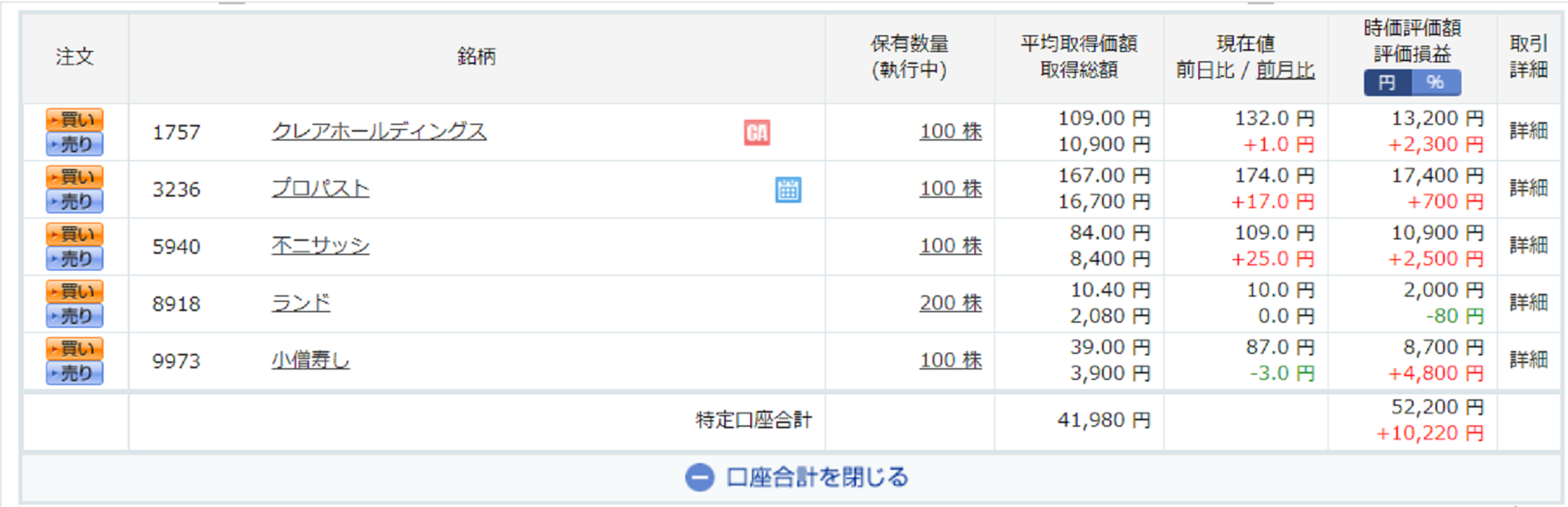 こんにちは巣ごもりサラリーマンです始めたばかりの株ですがまあまあ利益が出ています。ビギナーズラック継続中です不二サッシ +25円クレアホールディングス +23円小僧寿し +48円購入額:41,980円評価額:52,200円(13:00ごろ)10,000円ほど利益出ています。凄くうれしい早く売って利益確定した方がよいのかな~動きのない大黒屋さんは取りあえず、買った値段で売っちゃた