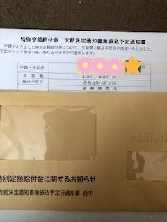 6/8 給付金が振り込まれました(たぶん)市役所から案内が届いているので間違いないと思います小さくてすみませんが振込予定日6/8と書いてあります。↓申請書を提出したのが5/25だったかな振り込まれるまで、2週間くらいでしょうかなかなか早い方だと思います。担当者様ありがとうございますもとは、我々が納めてる税金とは言え、家族4名で40万まあまあ使い道ありますよね少しでも経済協力したいけど・・・ボーナスが期待できないからその補填になっちゃうかもみなさんの地域では、給付金頂けてますか使い道は何が良いのでしょうねgo toキャンペーンに乗っかった方がイイのかな~