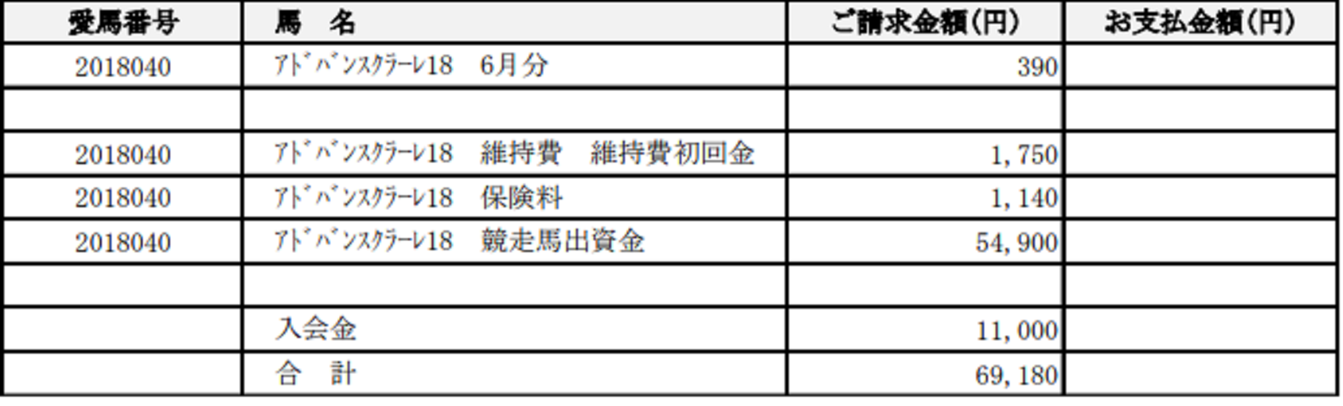 こんにちは 巣ごもりサラリーマンです。 ノルマンディーから、はじめての請求書が届きました。 いよいよ、愛馬の支払いです 分かっていたことですが、まあまあ高い 69,180円也 維持費初回金というのは、今まで経験なかったけど たいした金額でなくて良かった さてさて。。あとは応援するしかありませんなー とりあえず無事にデビューしてほしいです アドバンスクラーレ18 父:ドゥラメンテ × 母:アドバンスクラーレ(母の父:サクラバクシンオー) 牡馬 黒鹿 2018/5/14生生産:栃木・恵比寿興業株式会社那須野牧場 栗東・吉岡辰弥厩舎入厩予定 2,440万円(一口61,000円)
