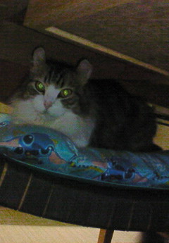 台所のテーブル下の椅子でくつろぐ幸太郎♪